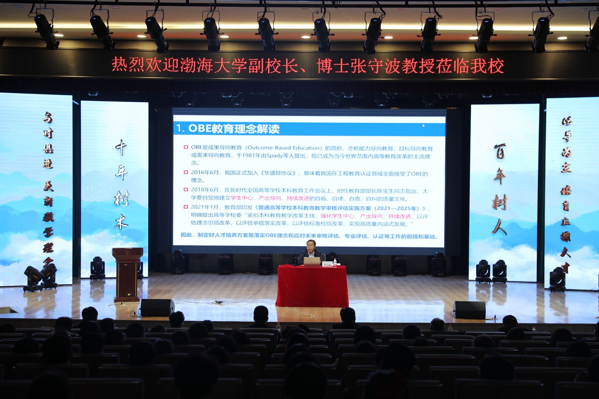 人间最美四月天,不负春光与时行。2023年4月19日下午,学校特邀渤海大学副校长、博士张守波教授,在厚德楼三楼报告厅为我校全体教职工作了题为“OBE理念下人才培养相关问题的思考”的专题报告。院长王秀山主持报告会。党总支书记安化春、副院长赵春利、副院长于士君、党总支副书记张猛、院长助理王树海出席报告会。